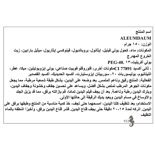 المكونات: ماء، كحول بولي فينيل، إيثانول، بروبانديول، فينوكسي إيثاريول، ميثيل بارابين، زيت الخروع المهدرج
