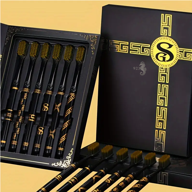 مجموعة فرش أسنان الفاخرة باللون الأسود من 6 قطع – شعيرات ناعمة لتنظيف شامل، مثالية لنظافة الفم اليومية للبالغين